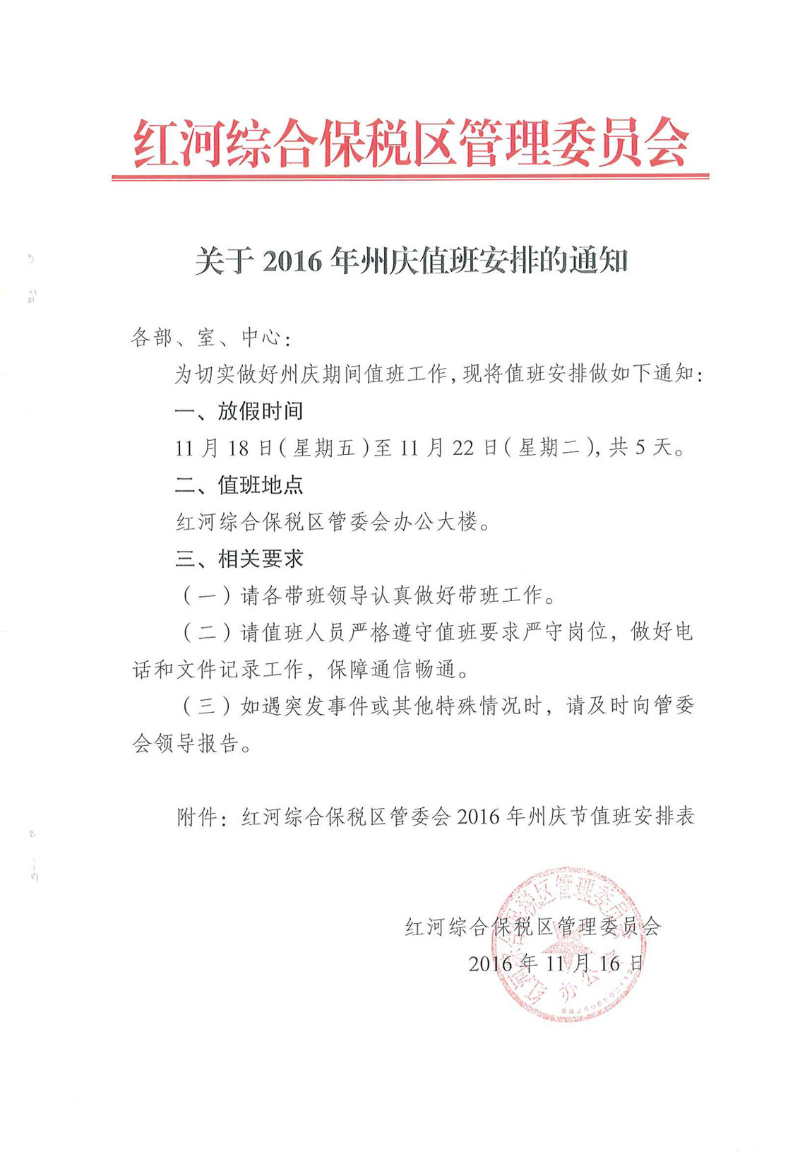 关于2016年州庆值班安排的通知